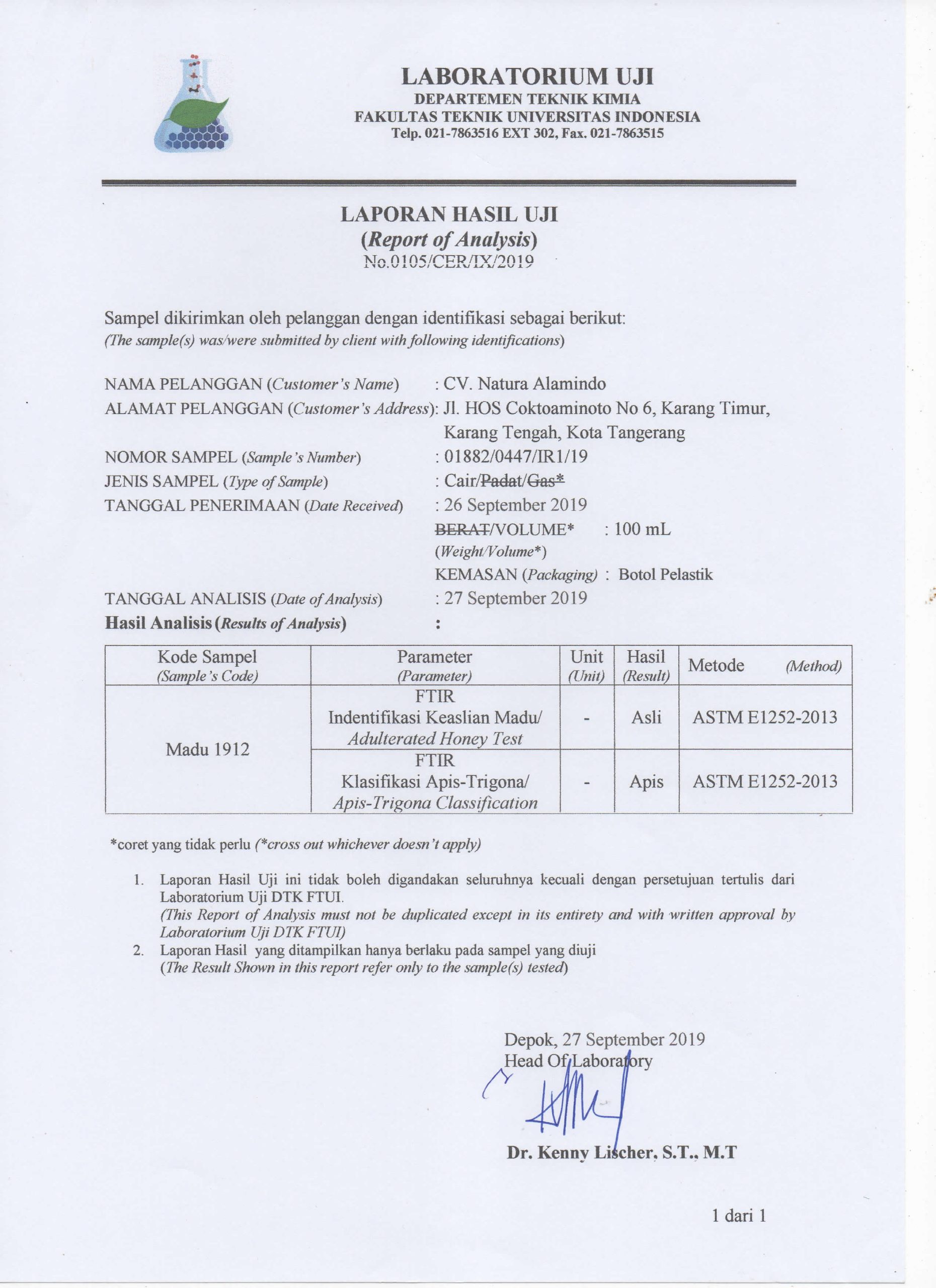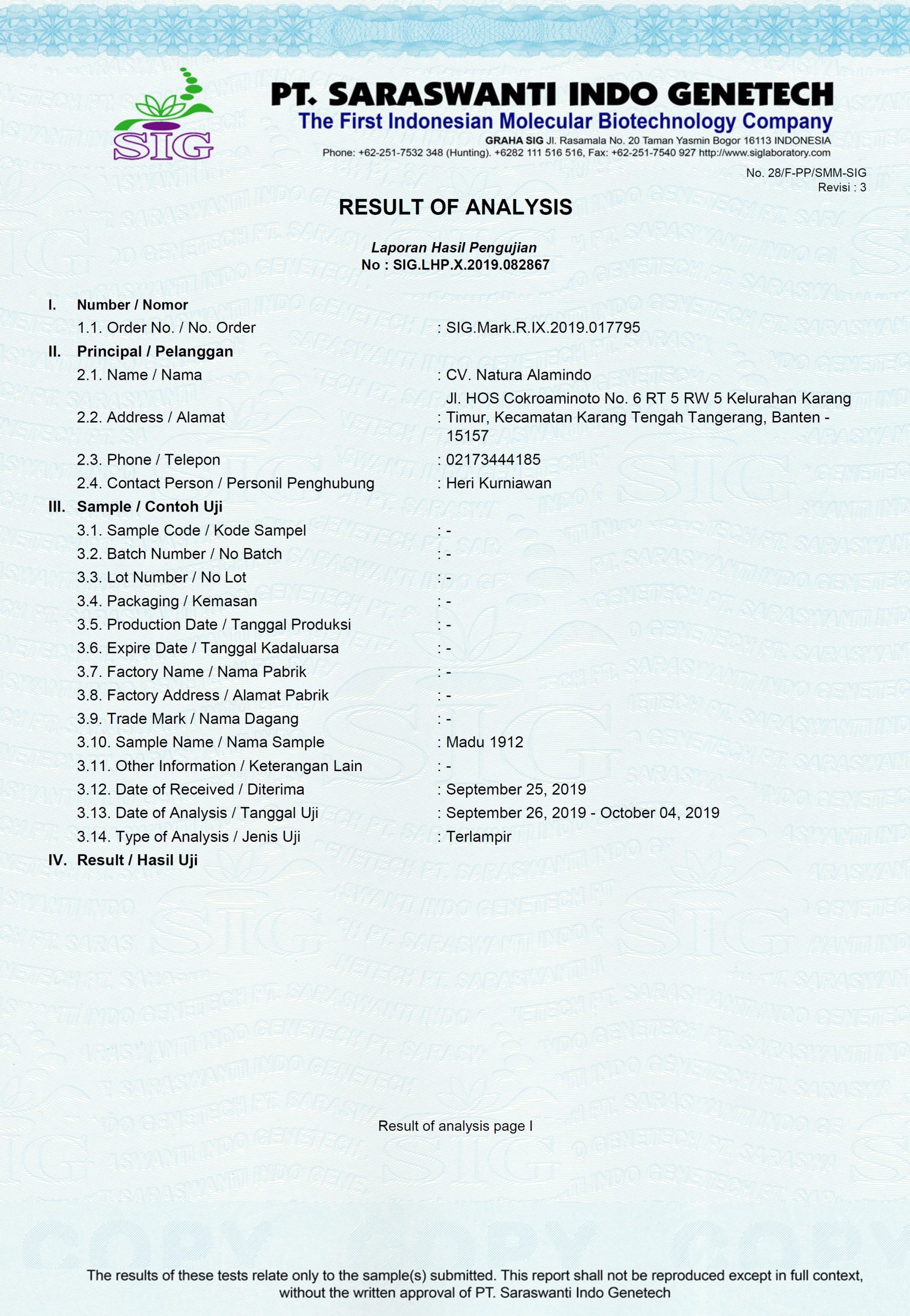 Uji lab berupa kualitas dan keaslian madu dilakukan untuk setiap batch produksi guna memastikan madu yang sampai ke tangan anda benar-benar aman dan murni sehingga anda dapat menikmati madu tanpa ragu sampai tetes terakhirnya.4(empat) digit terakhir pada LOT number adalah nomer madu yang tertera pada dokumen hasil lab.Selamat menikmati, MINUM MADU TANPA RAGU!